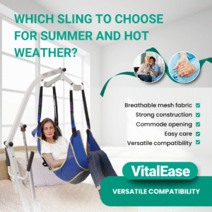 In summer, it’s especially important to ensure maximum comfort for both the patient and the caregiver. In hot weather, heavy, dense slings can trap heat, causing discomfort and even skin irritation. VitalEase offers a universal solution — lightweight, breathable, and hygienic slings that are perfect for warm days.