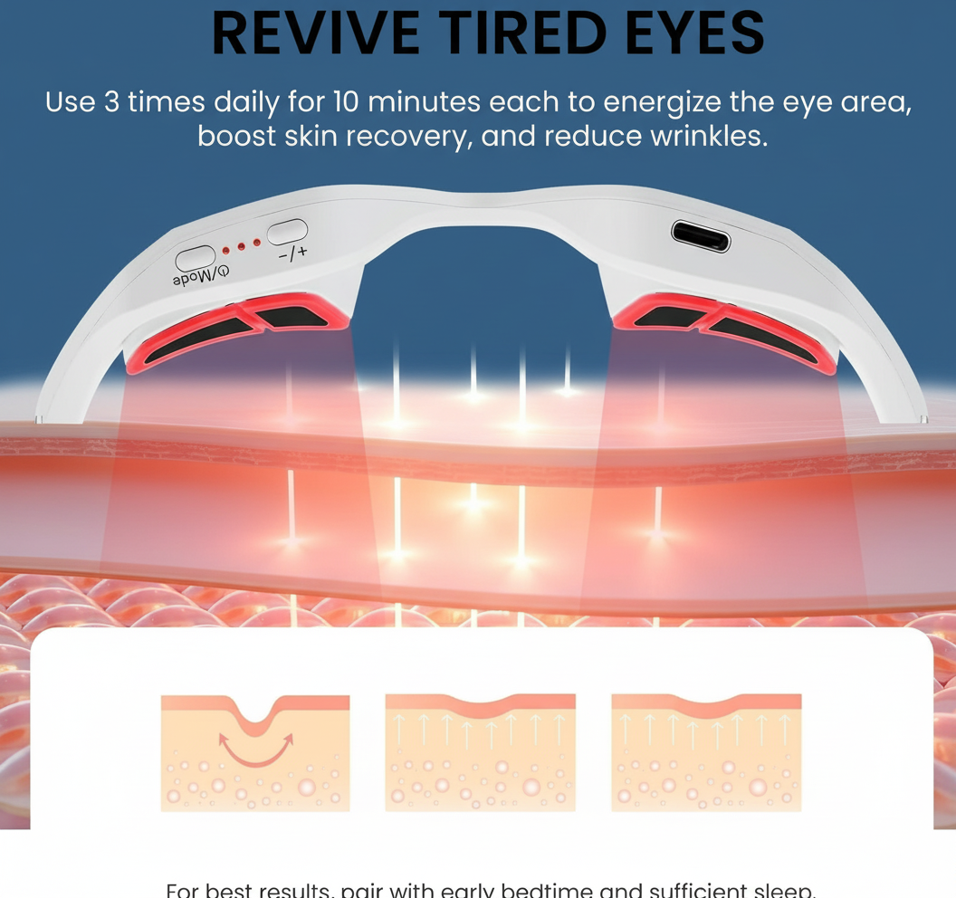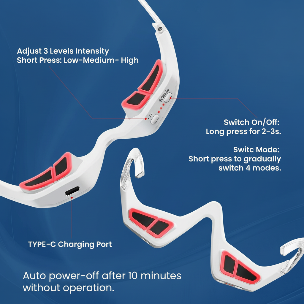 - Advanced Red Light Therapy for Youthful Eyes: Our Under Eye Red Light Massager Glasses utilize cutting-edge red light technology to stimulate collagen production, reduce dark circles, and diminish fine lines. Enjoy a 10-minute daily session to revitalize tired eyes, leaving them refreshed and radiant. Perfect for busy professionals and screen users.